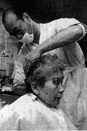 頭を切って3日に出発した区心身障害者福祉センターの保母、和合譲子さん(43)の紹介で、大川さんは兵庫県西宮市の「すばる福祉会」のボランティアに参加する。大川さんの実家は、同区南千住八の理髪店を経営している。20歳の時、大川さんは理容師の資格を取得し、中央区などの理髪店で約1年間修行をしていたが、シャンプーによる手の荒れがひどかったことから後継ぎを断念。1974年に区役所に入った。11日に西宮入りした大川さんは「役立つことがあれば」と、実家からハサミ3丁、カミソリ2丁、バリカン1つ等を借り、ボストンバックで持参。福祉会側の要請を受け、避難所とお年寄り方を回ることになった。ポットのお湯と、水のいらないドライシャンプーを使い18人に散髪、洗髪をした。散髪とマッサージをした八十代の夫婦は「一生忘れない」。数週間ぶりに髪を洗う人も多く、久しぶりの爽快感を味わうお年寄りらの顔が忘れられない。
